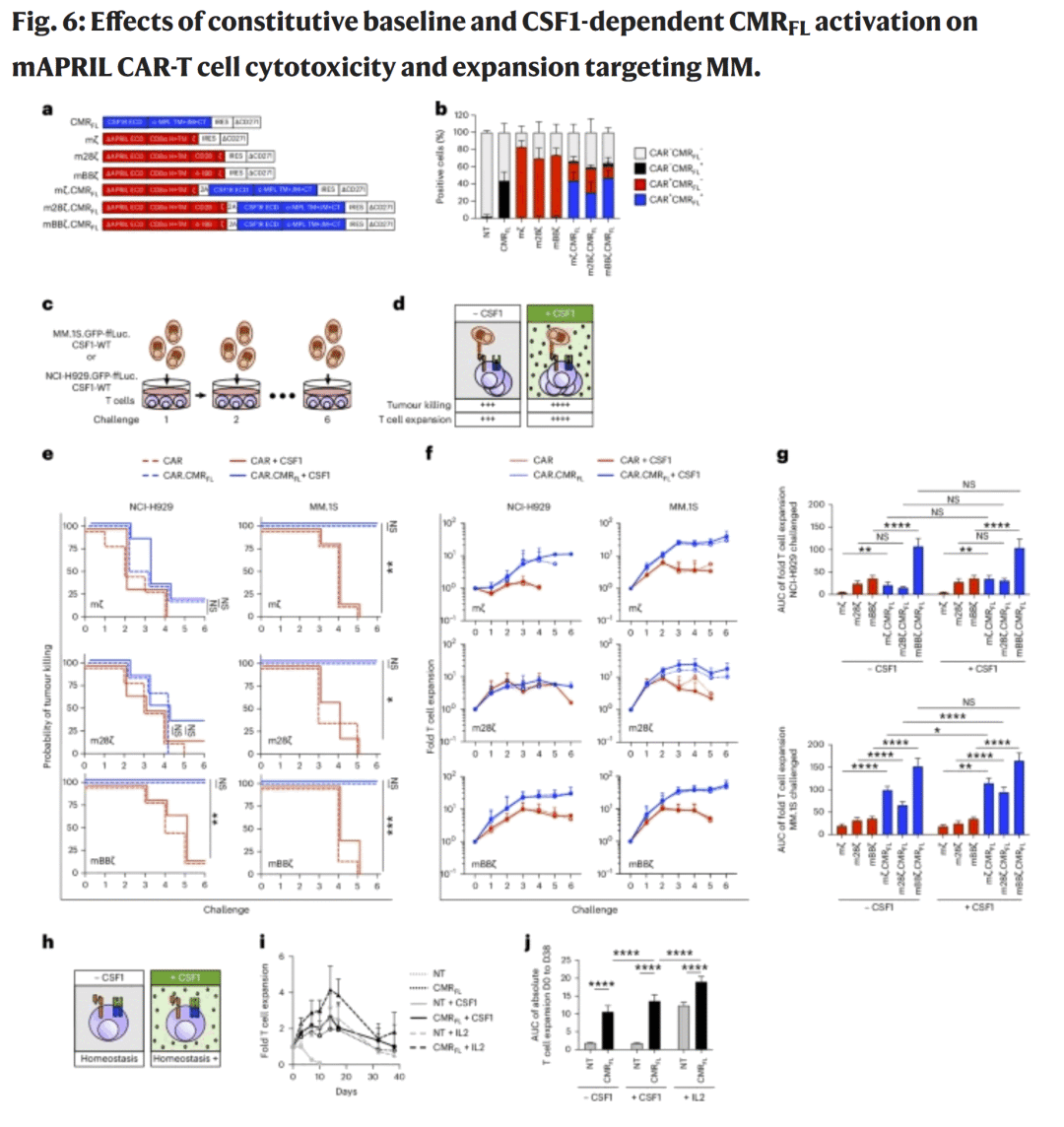 图6. CSF1-T-SenSER增强BCMA-CAR-T细胞的持久性与细胞因子反应