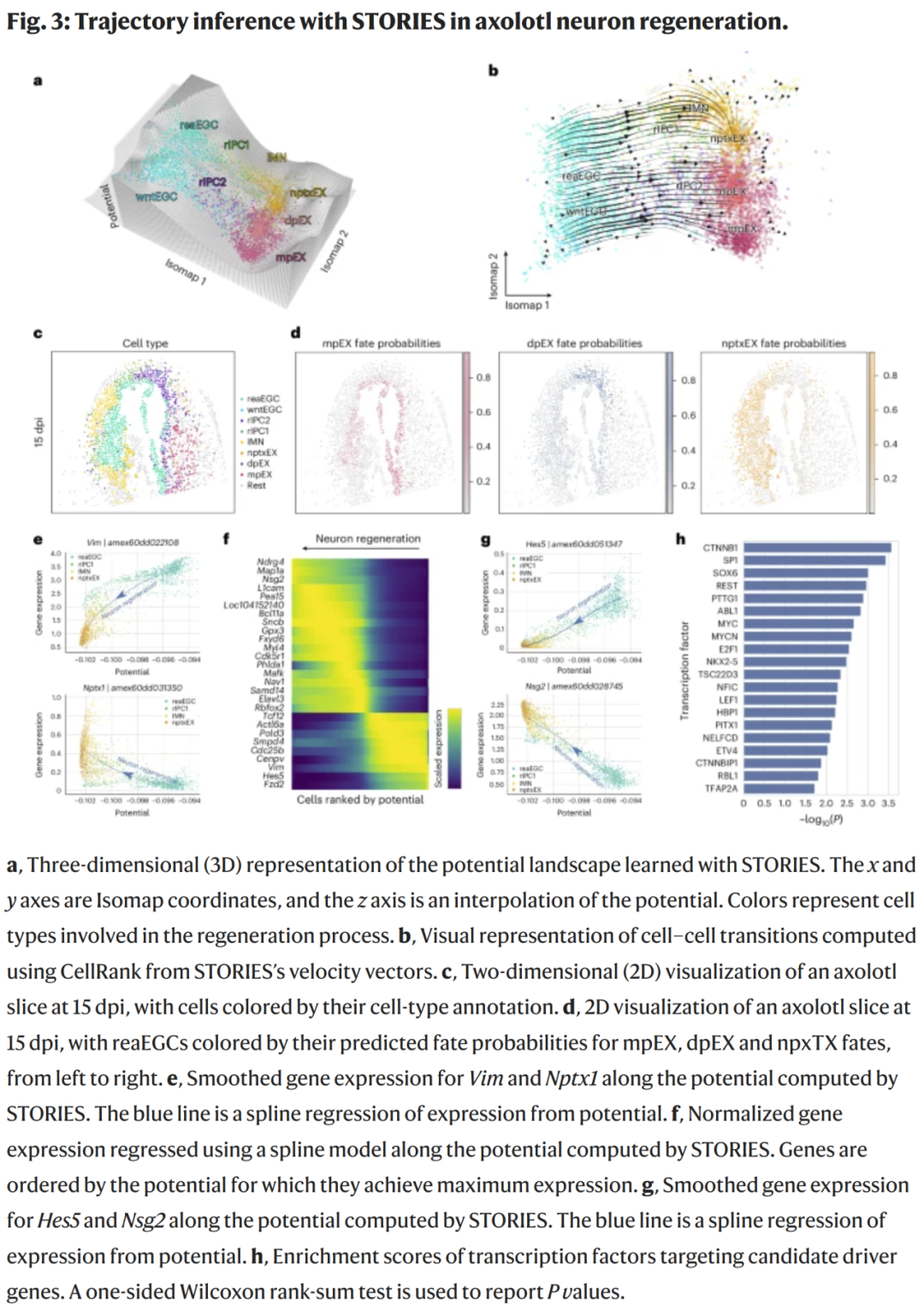 研究人员在钝口螈脑再生的空间转录组数据中训练 STORIES,聚焦于神经再生相关的细胞类型,包括 EGC、rIPC、IMN 及不同类型的兴奋性神经元。