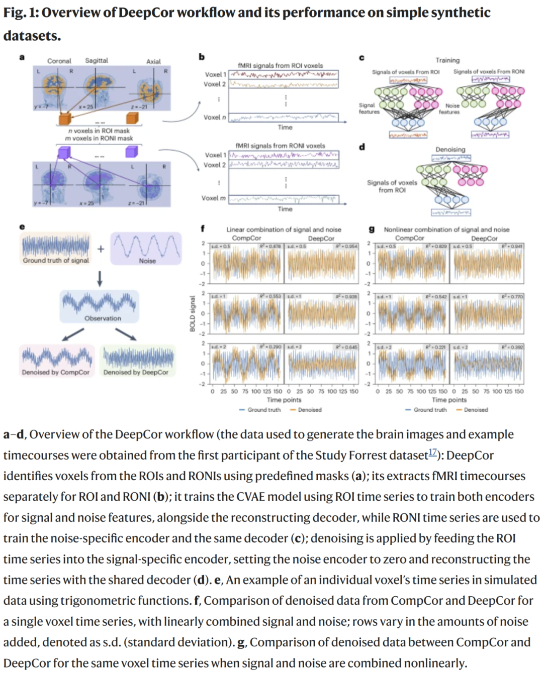 DeepCor 首先从兴趣区(ROI)提取包含信号与噪声的体素时间序列,并从无兴趣区(RONI)提取仅包含噪声的体素。模型使用对比变分自编码器,将 ROI 时间序列分别编码为“信号特征”和“噪声特征”,而 RONI 仅用于训练“噪声特征”路径。在推理阶段,将 ROI 的“噪声特征”置零后再通过解码器重建,即得到去噪后的 fMRI 时间序列。研究人员将每个体素视为独立样本,并构建训练、验证、测试集,以实现可靠训练并避免过拟合。