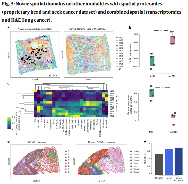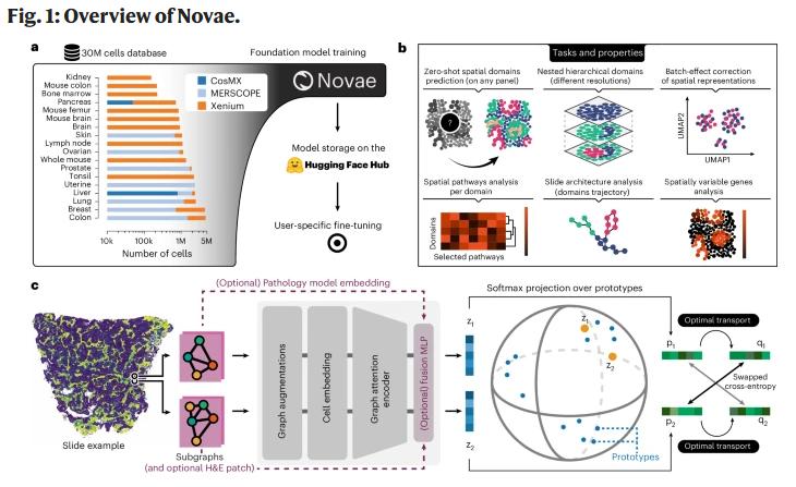 研究人员构建 Novae——一个基于图注意力网络的自监督基础模型。模型将细胞视为图节点,并以邻域空间关系作为图结构。通过对近 3,000 万细胞、来自 18 种组织与多平台(Xenium、MERSCOPE、CosMX)的数据进行训练,Novae 能学习细胞局部环境的空间表示。模型包含:空间邻域编码、自监督对比学习、跨面板学习策略、原生批次效应校正,以及层级空间结构域生成机制。Novae 可直接用于零样本推理,也可根据任务执行微调。