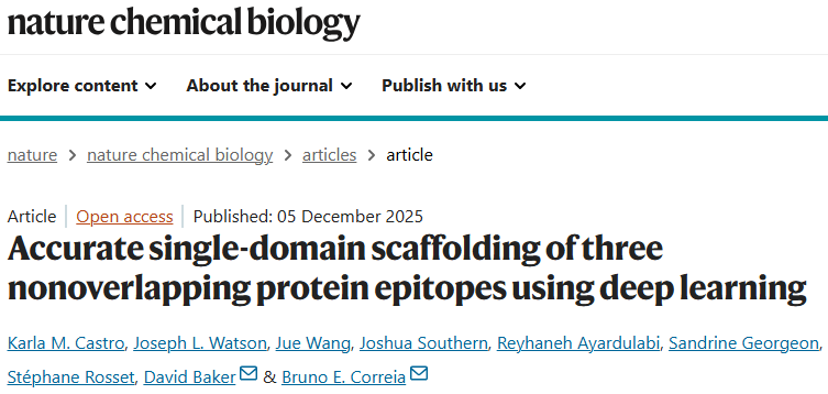 Castro, K.M., Watson, J.L., Wang, J. et al. Accurate single-domain scaffolding of three nonoverlapping protein epitopes using deep learning. Nat Chem Biol (2025).