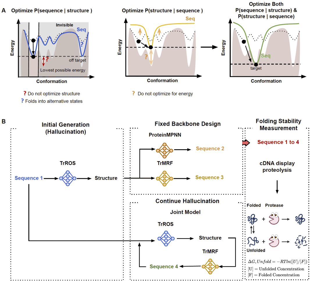 从头蛋白设计近年来受益于生成式模型的快速发展,使研究人员能够同时生成全新的蛋白结构与序列。然而,一个长期存在的核心难题仍未完全解决:如何确保设计得到的序列能够稳定折叠为目标构象,并且该构象是其全构象景观中的最低能态。本研究系统性比较了三类蛋白设计范式——仅基于结构到序列、仅基于序列到结构,以及二者的联合优化策略。结果表明,同时优化序列与构象景观,能够显著提升蛋白折叠稳定性,并更真实地刻画蛋白的能量景观,为稳定从头蛋白设计提供了一种更具物理一致性的路径。