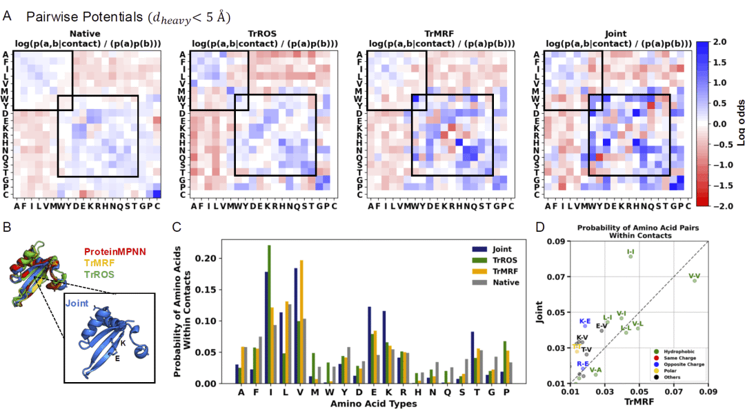 这种相互作用模式在仅基于固定骨架的序列设计中并不明显,提示联合优化能够引导模型学习更符合蛋白物理化学规律的设计偏好。
