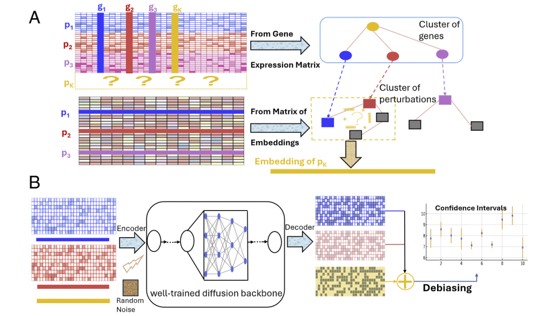 该方法在变分自编码器的潜在空间中,结合扩散生成模型与无分类器引导机制,并引入预测驱动推断(prediction-powered inference)以系统性校正生成模型中的偏差。通过利用已测扰动之间的表达相似性与聚类结构,dbDiffusion 能够可靠生成未观测扰动的平均基因表达效应及其不确定性区间。基准测试表明,该方法在多个 Perturb-seq 数据集上优于现有主流方法,为扩展单细胞扰动实验的分析能力提供了一种可扩展的计算框架。