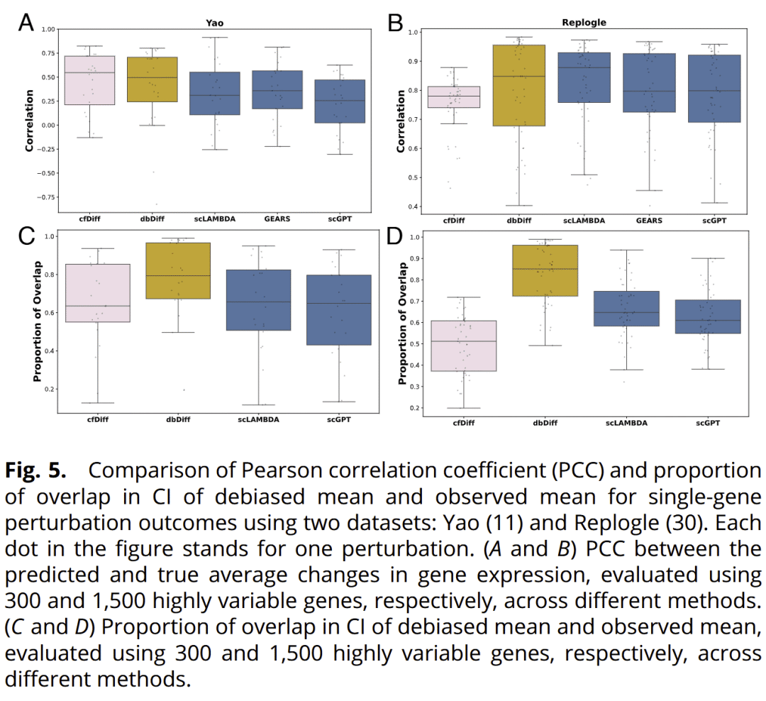 在两个大规模 Perturb-seq 数据集上,dbDiffusion 能够稳定预测未观测扰动下的平均基因表达变化,并在多个指标上优于现有方法,尤其在效应较大的扰动场景中表现突出。