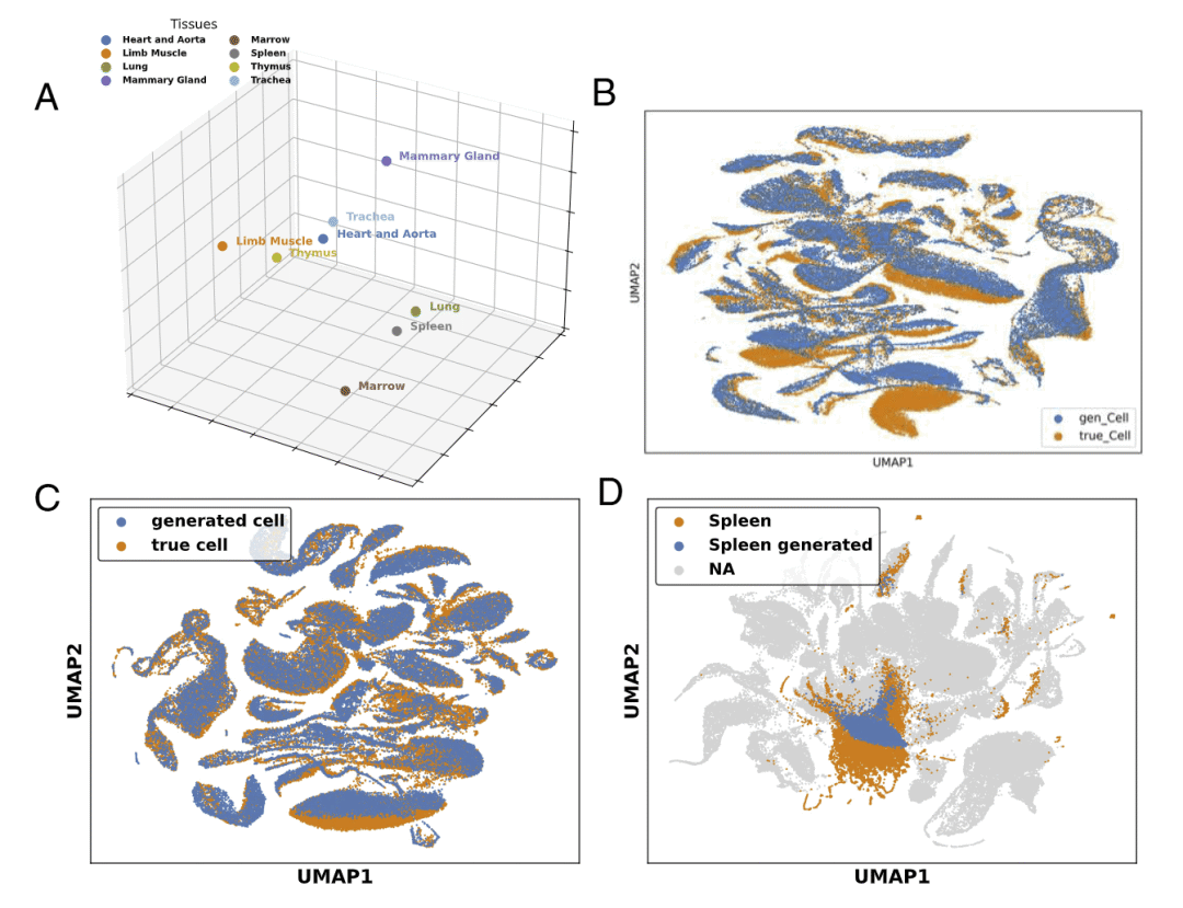 图2|基于连续嵌入的扩散生成细胞分布可视化。