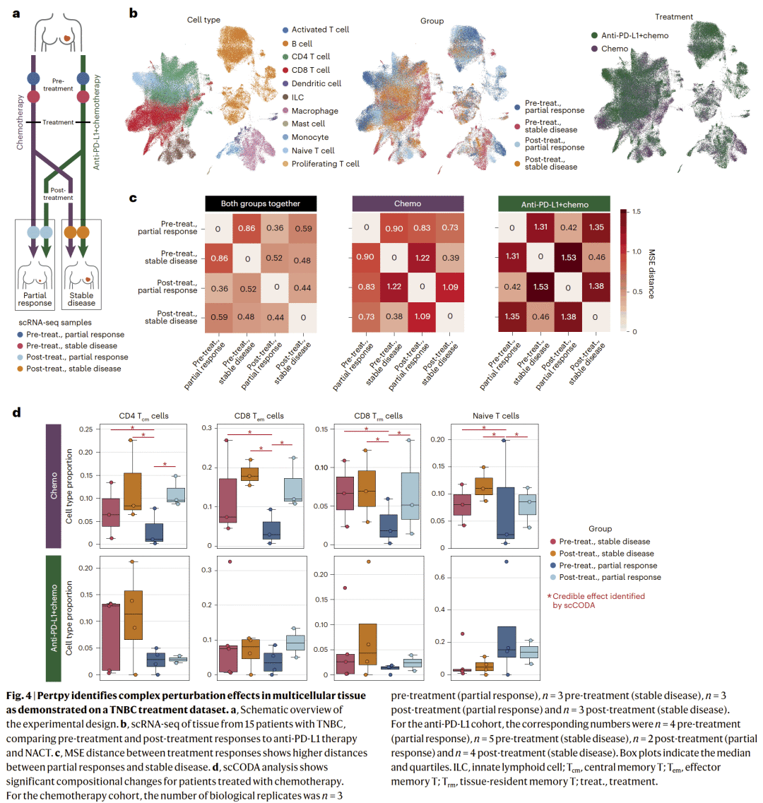 在肿瘤治疗相关的单细胞数据中,Pertpy 能够同时分析扰动引起的细胞类型比例变化和多细胞协同程序。研究人员借此识别了与治疗响应相关的关键免疫细胞亚群及其协同调控特征。