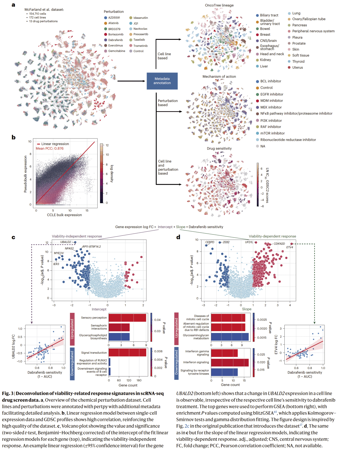 在大规模药物扰动数据集中,Pertpy 通过整合药物敏感性信息,将基因表达响应分解为与细胞存活相关和与存活无关的两类效应。该分析揭示了传统机制注释难以捕捉的调控路径,为药物作用机制提供了新的解释维度。