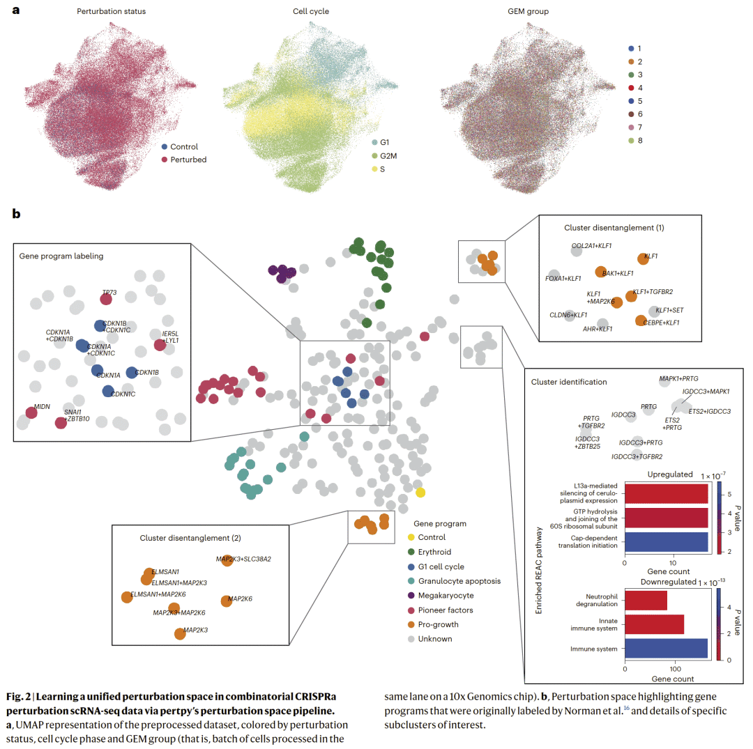 在组合基因扰动实验中,该表示能够有效区分不同基因程序,并进一步细化或修正已有的生物学注释。