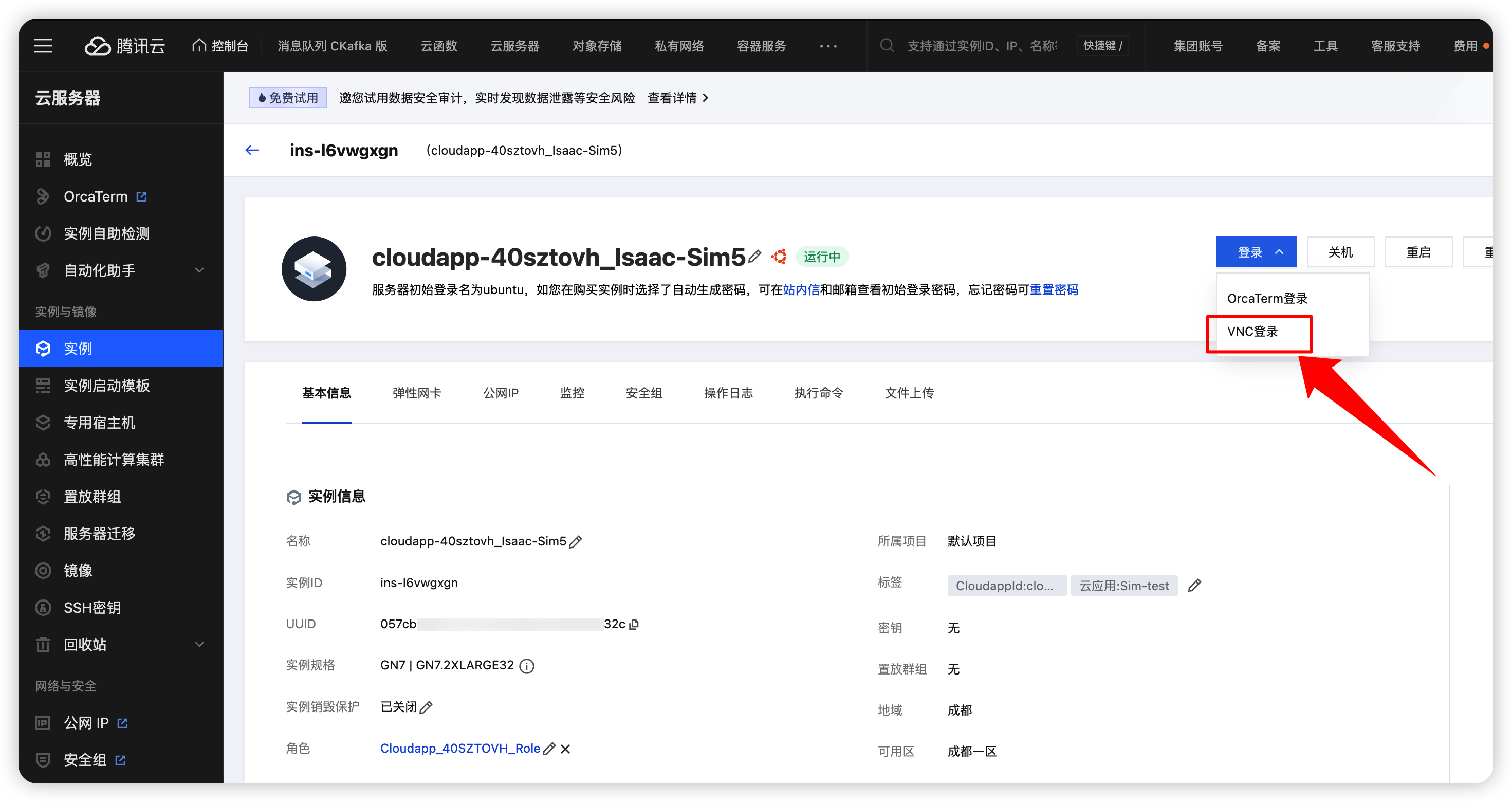 到CVM的详情页面,选择“VNC登录”。