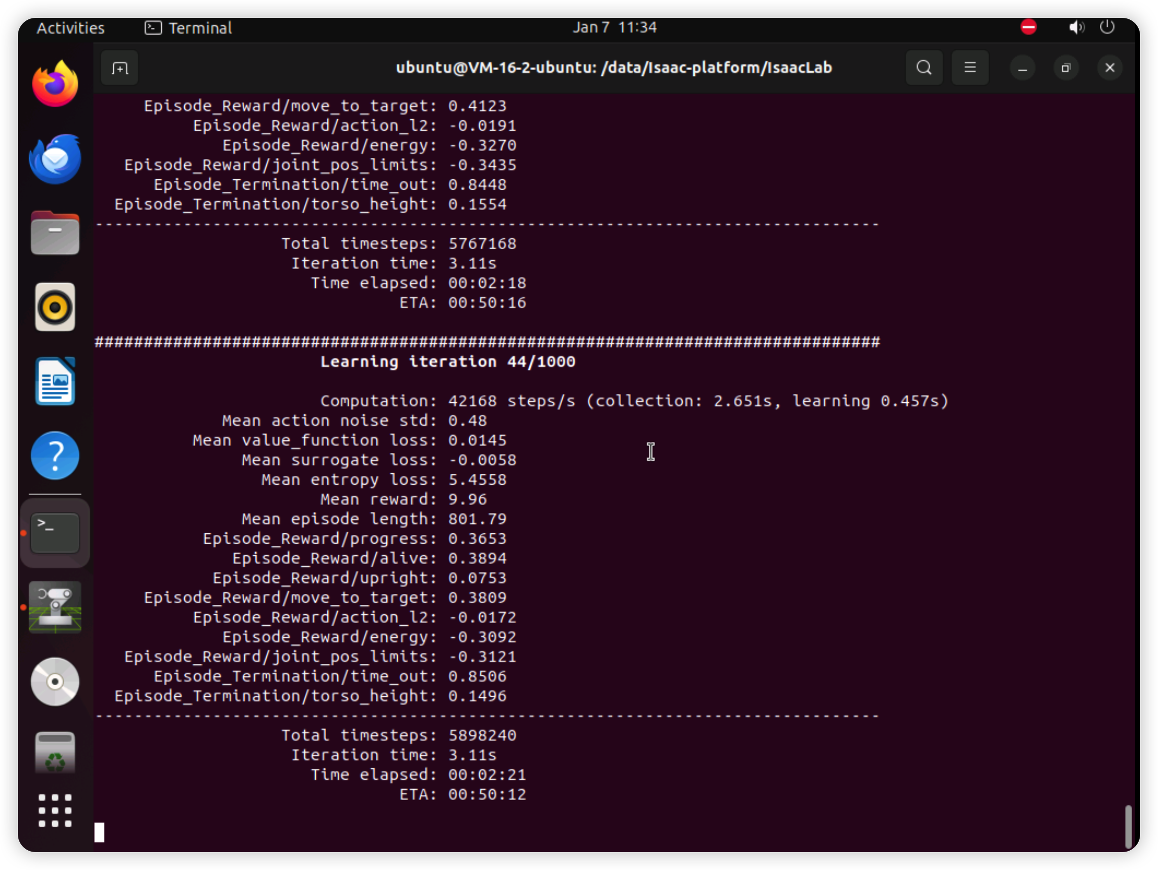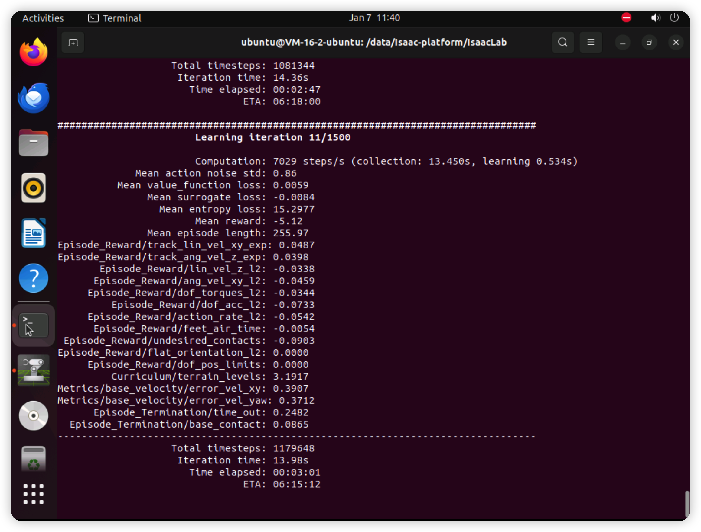 学习的轮次越多机器狗走路越稳,摔倒越少。