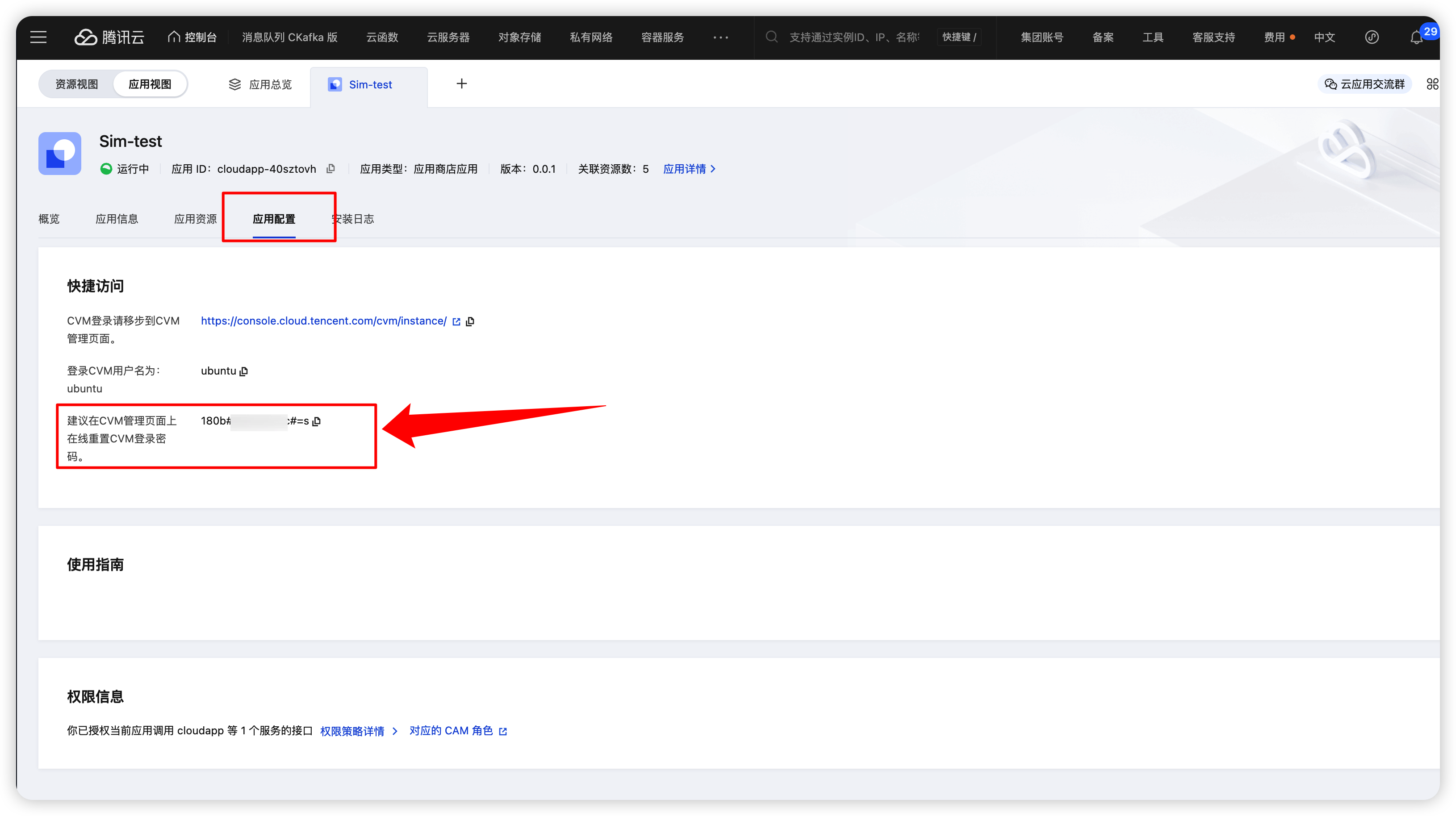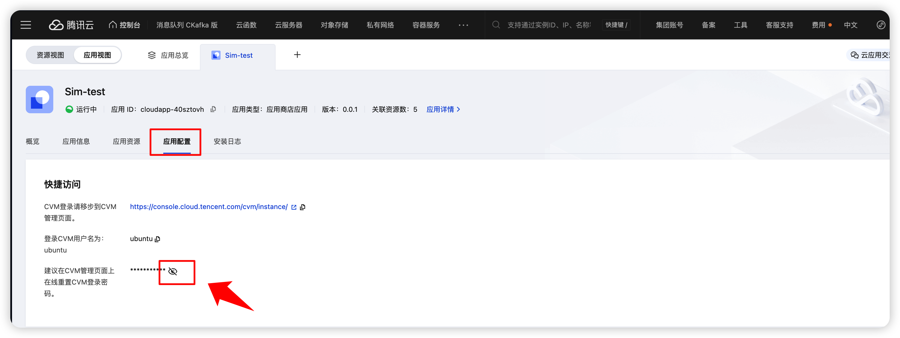 登录密码在“应用配置”页面,点击显示密码信息。