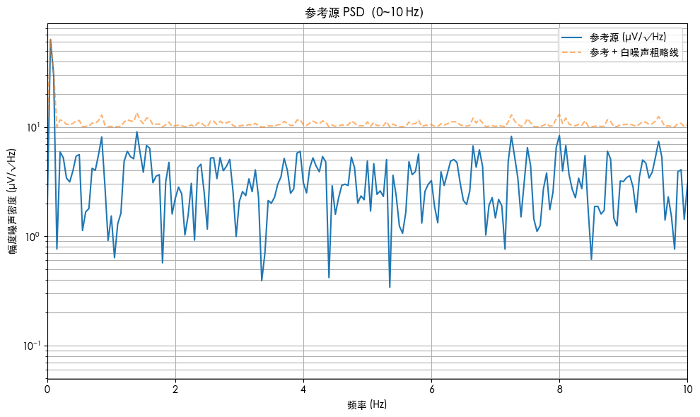 真实参考源 v_ref(t):包含低频漂移(0.05 Hz)、随机游走、40 µV_rms 高频抖动