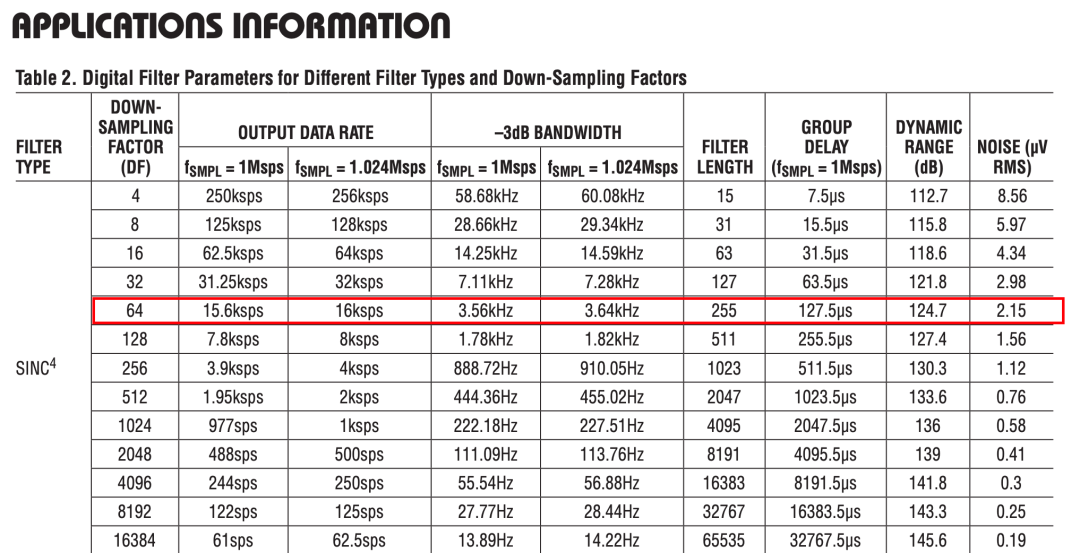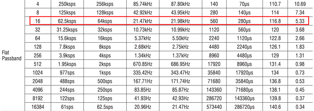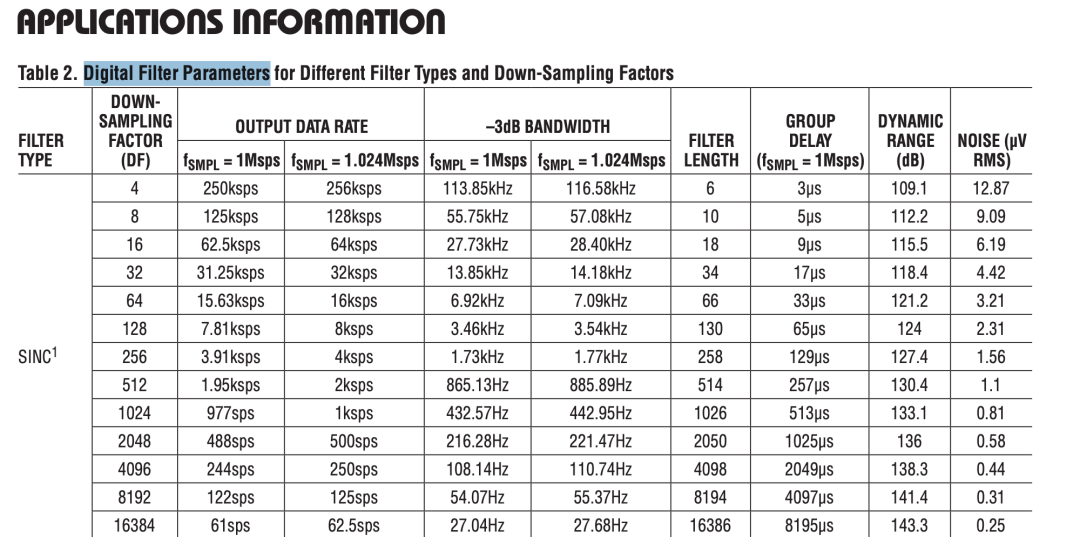数据手册在 Table 2 “Digital Filter Parameters…” 里,已经给出了每种滤波器、每个 DF 的: