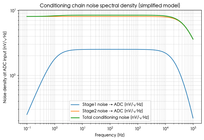 按“每级噪声乘上对应传函”的方式算:Stage1 噪声:通过 H1+H2,到 ADC 输入端;Stage2 噪声:只乘 H2,到 ADC 输入端;两者功率谱相加,得到总 V²/Hz;取平方根就是 nV/√Hz。