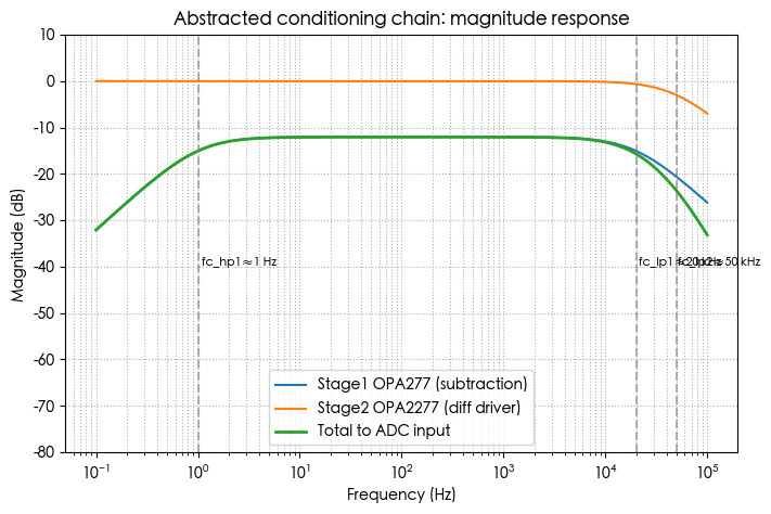 说明一下假设:论文没有给出具体 R/C 数值,我用了一套“符合文中描述 + 柴油机 2Hz~1kHz 应用”的合理参数,搭了一个等效两级模型: 一级:OPA277 减法 + AC 耦合 + 低通(带宽 1 Hz~20 kHz,增益 0.25) 二级:OPA2277 单端→差分驱动 AD7771(带宽到 50 kHz,增益 1)