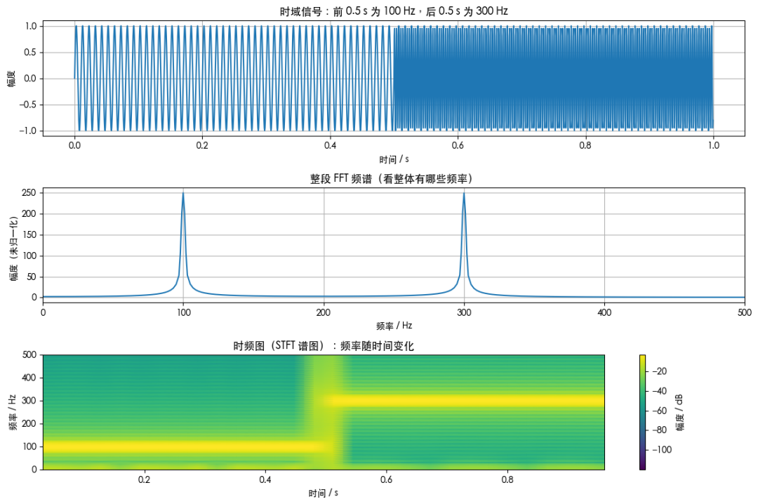 FFT 完全不知道“100 Hz 是前半段出现、300 Hz 是后半段出现”,只知道“这一整段 1 s 里面同时存在这两个频率成分”。