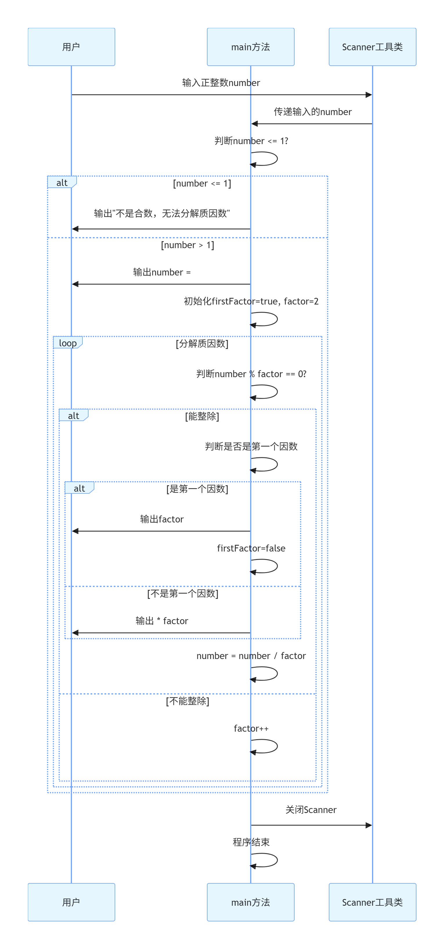 Scanner 类从用户那里读取一个正整数。firstFactor,用于控制输出格式,确保在第一个质因数前面不输出乘号。for 循环从2开始遍历可能的质因数。while 循环检查当前数是否能被 factor 整除,如果能,则输出 factor 并将 number 除以 factor。firstFactor 为 false,则在输出前添加一个乘号 *。number = 质因数1 * 质因数2 * ... * 质因数n。假设用户输入 90,程序的输出将是: