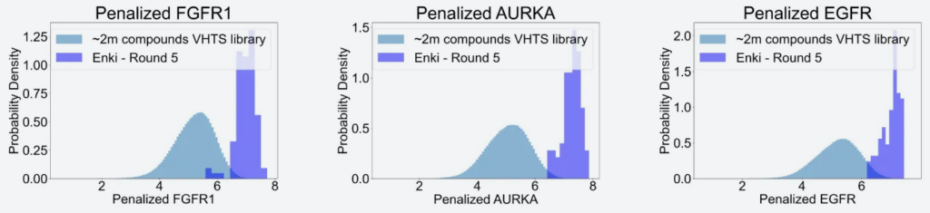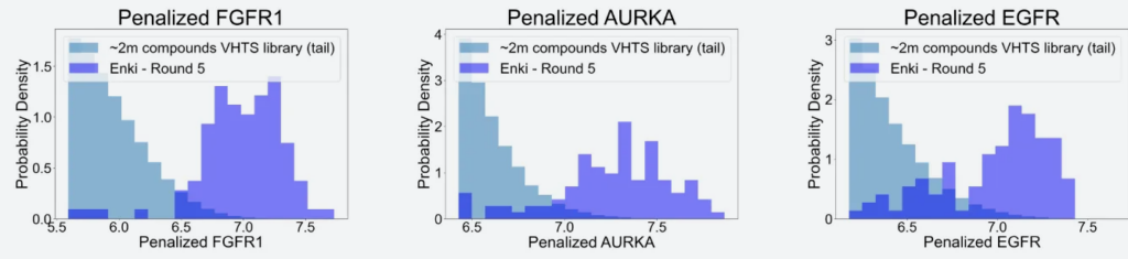 图 2:对于三个基准任务,高通量筛选文库和 Enki 优化分子在高通量筛选文库和 Enki 优化分子上的分布。