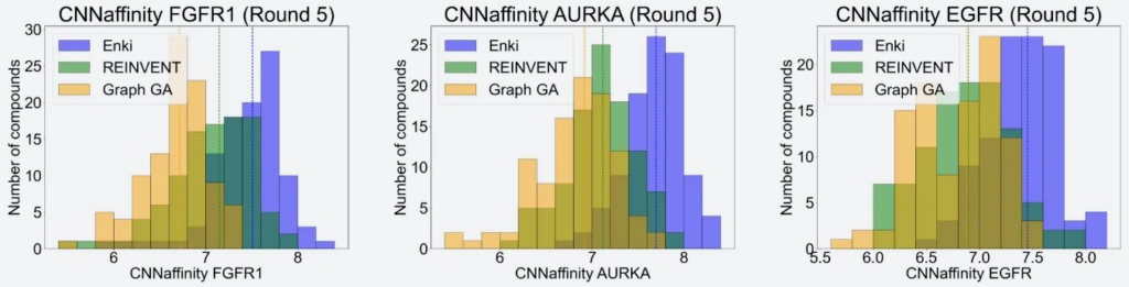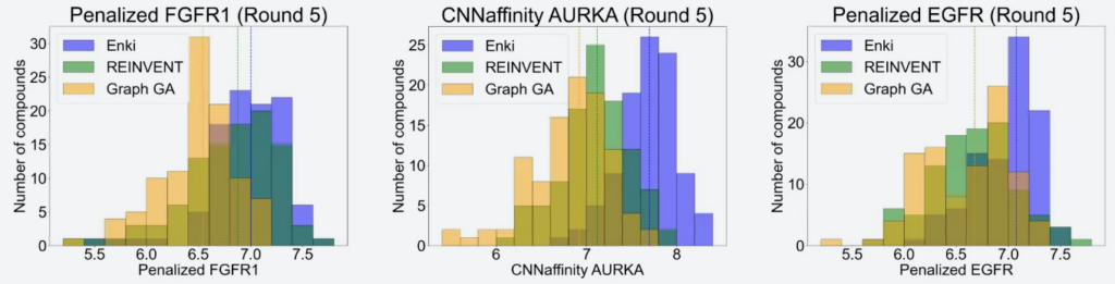 图 9:第五轮主动学习中 Enki、REINVENT 和 Graph GA 优化分子的优化目标分布。每个分布的平均值用虚线表示。