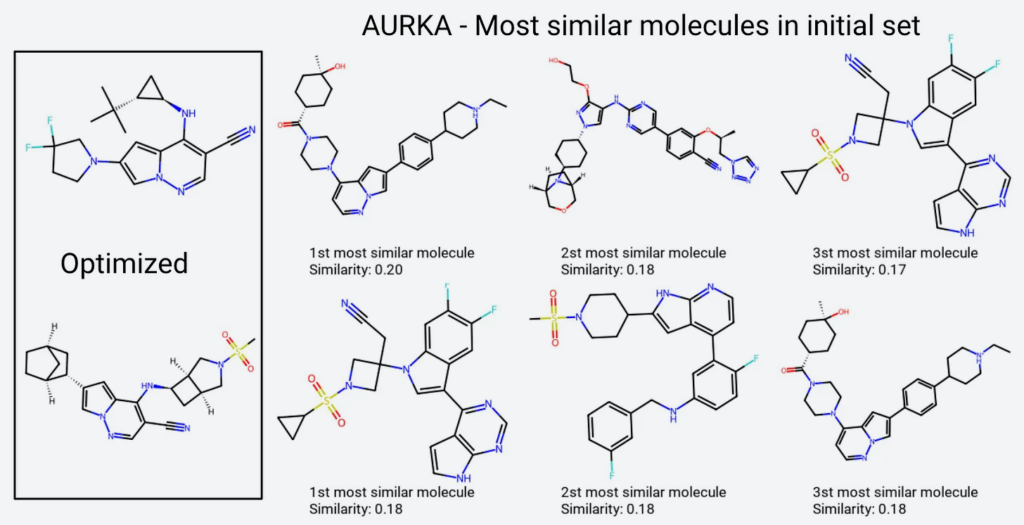 图 5:AURKA 效力第五轮主动学习中 Enki 优化分子的示例,以及用于初始化优化的 100 个分子集中最相似的分子。