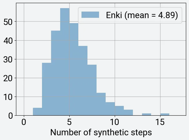 图 7:第五轮主动学习中 Enki 优化分子的逆合成途径预测的合成步骤数分布。
