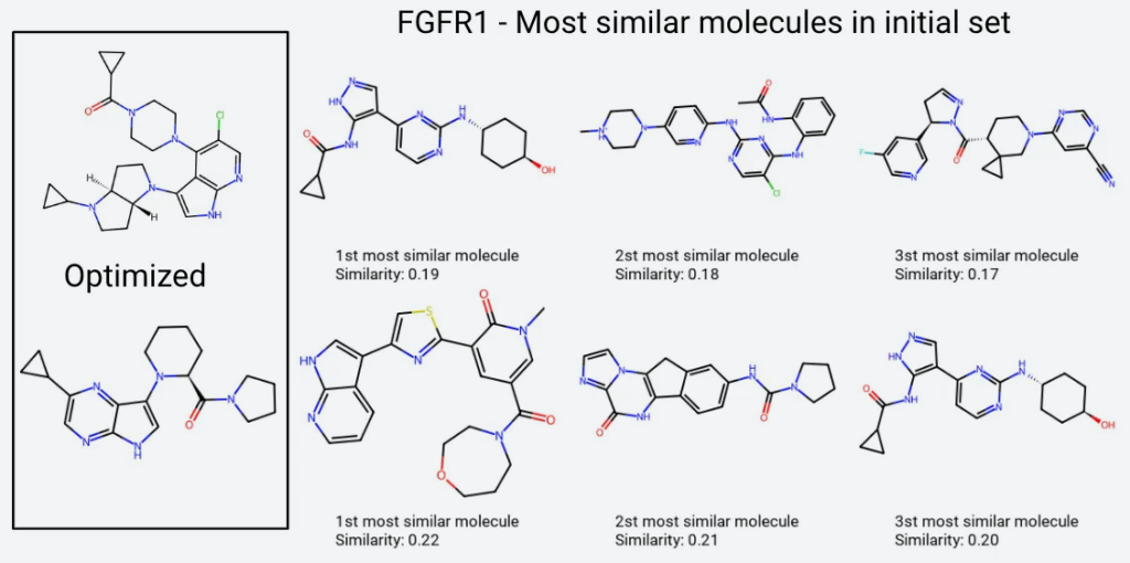 图 4:FGFR1 效力第五轮主动学习中 Enki 优化分子的示例,以及用于初始化优化的 100 个分子集中最相似的分子。