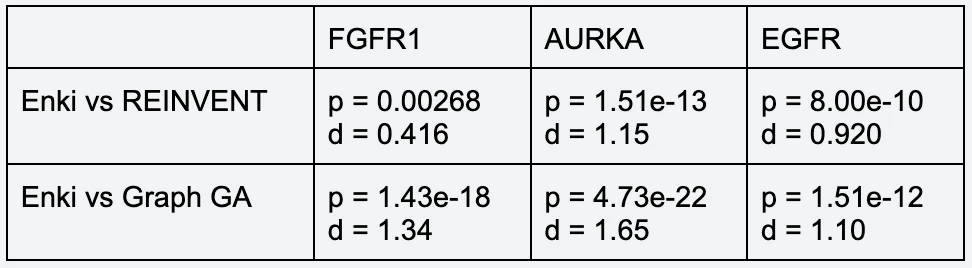 表 1:Enki 生成的第五轮主动学习分子与 REINVENT 和 Graph GA 的统计比较。P 值使用 Mann-Whitney U 检验计算,效应大小使用 Cohen 的 d 进行评估。d = 0.2 被认为是小效应量,d=0.5 是中等,d=0.8 则是大,1.2 是非常大。