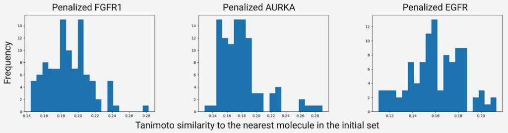 图 6:从第五轮主动学习到 3 个基准任务的初始 100 个分子集中最接近的分子的 Enki 优化分子的谷本相似性分布。