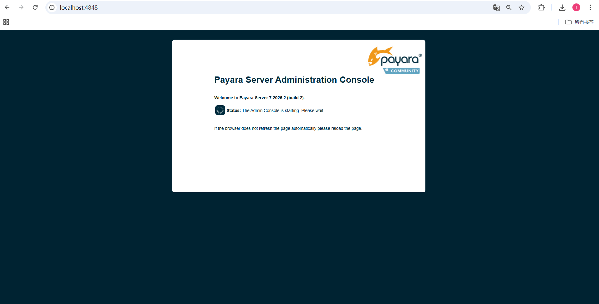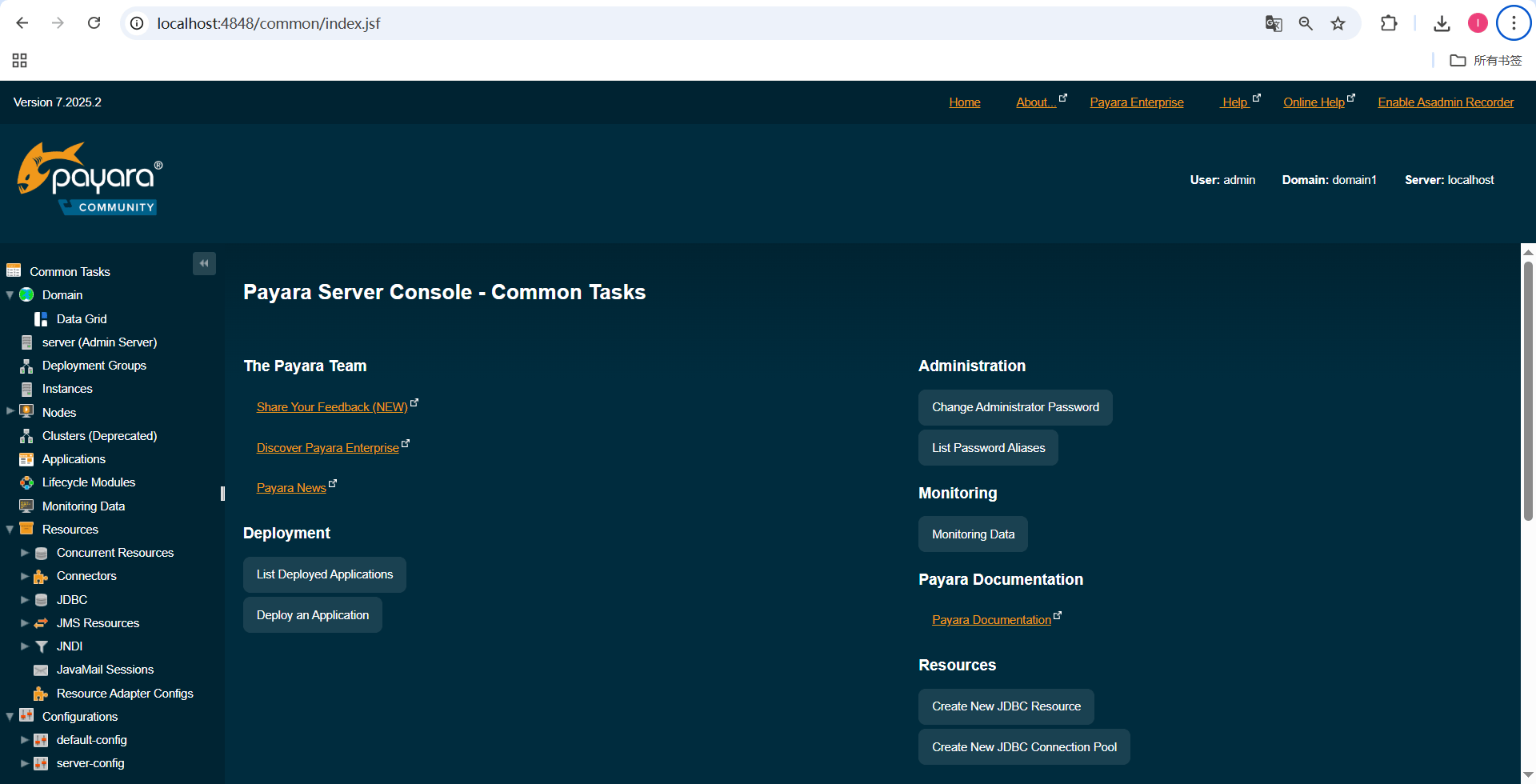 8. 启动完成之后,就可以看到提示 Admin Port:4848,这时候,我们在浏览器输入localhost:4848,就可以进入到web管理页面了。