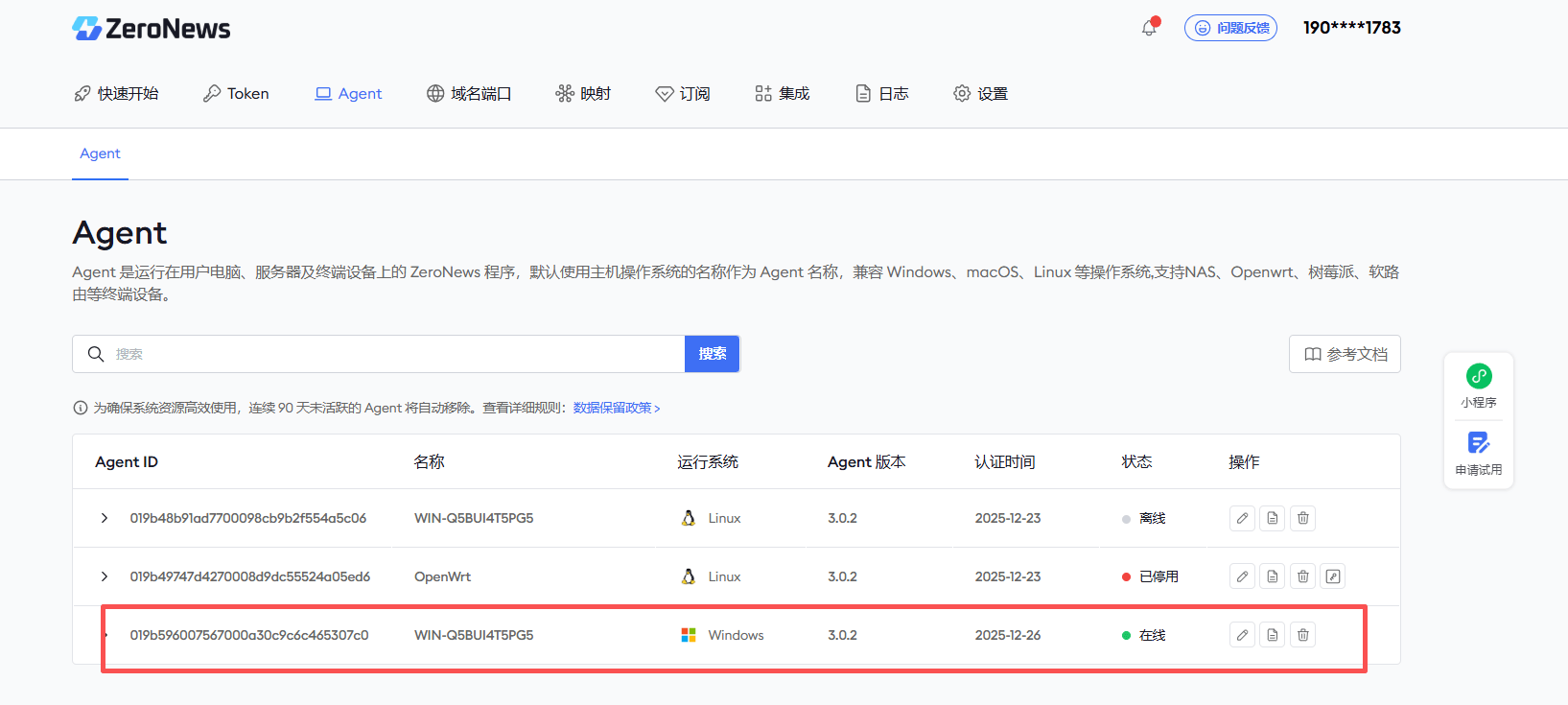 1、 运行完成之后,您可以在 Agent 页面看到已经在线的 Agent 服务。