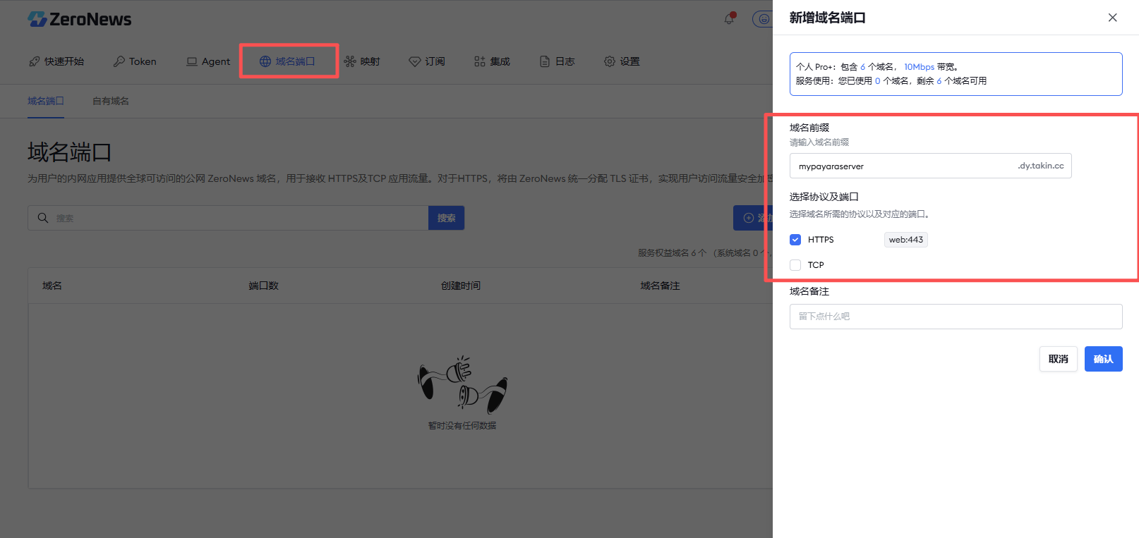 2、 接着,我们在域名端口页面,创建一个可用的公网域名(自定义前缀),并勾选HTTPS 协议端口。