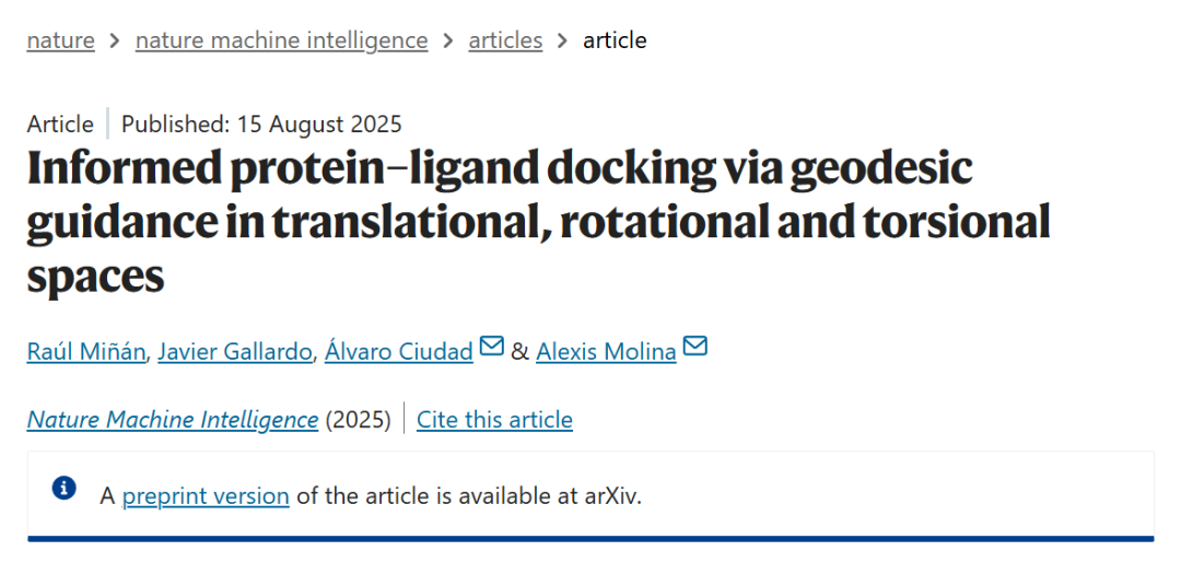 论文: Informed Protein–Ligand Docking Via Geodesic Guidance in Translational, Rotational and Torsional Spaces 期刊: Nature Machine Intelligence 链接: https://doi.org/10.1038/s42256-025-01091-x 代码: https://github.com/NBDsoftware/GDD https://doi.org/10.5281/zenodo.15755564