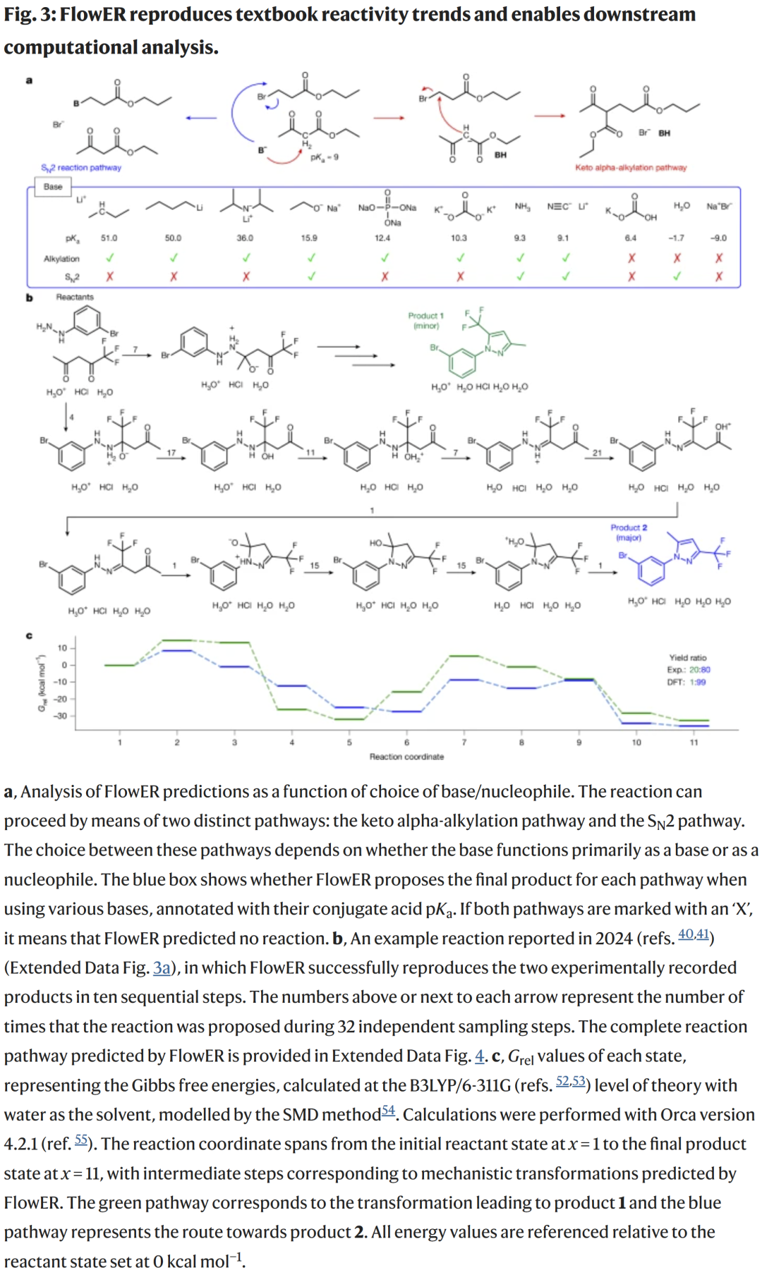 FlowER 在预测中自然反映了酸碱性与亲核性等基本化学规律。例如,在 β-酮酯 α-位烷基化反应中,它能够依据不同碱的 pKa 值与亲核性选择不同路径(SN2 或 α-烷基化),结果与化学直觉一致。这说明模型不仅学习了统计规律,还内化了基础化学原理。