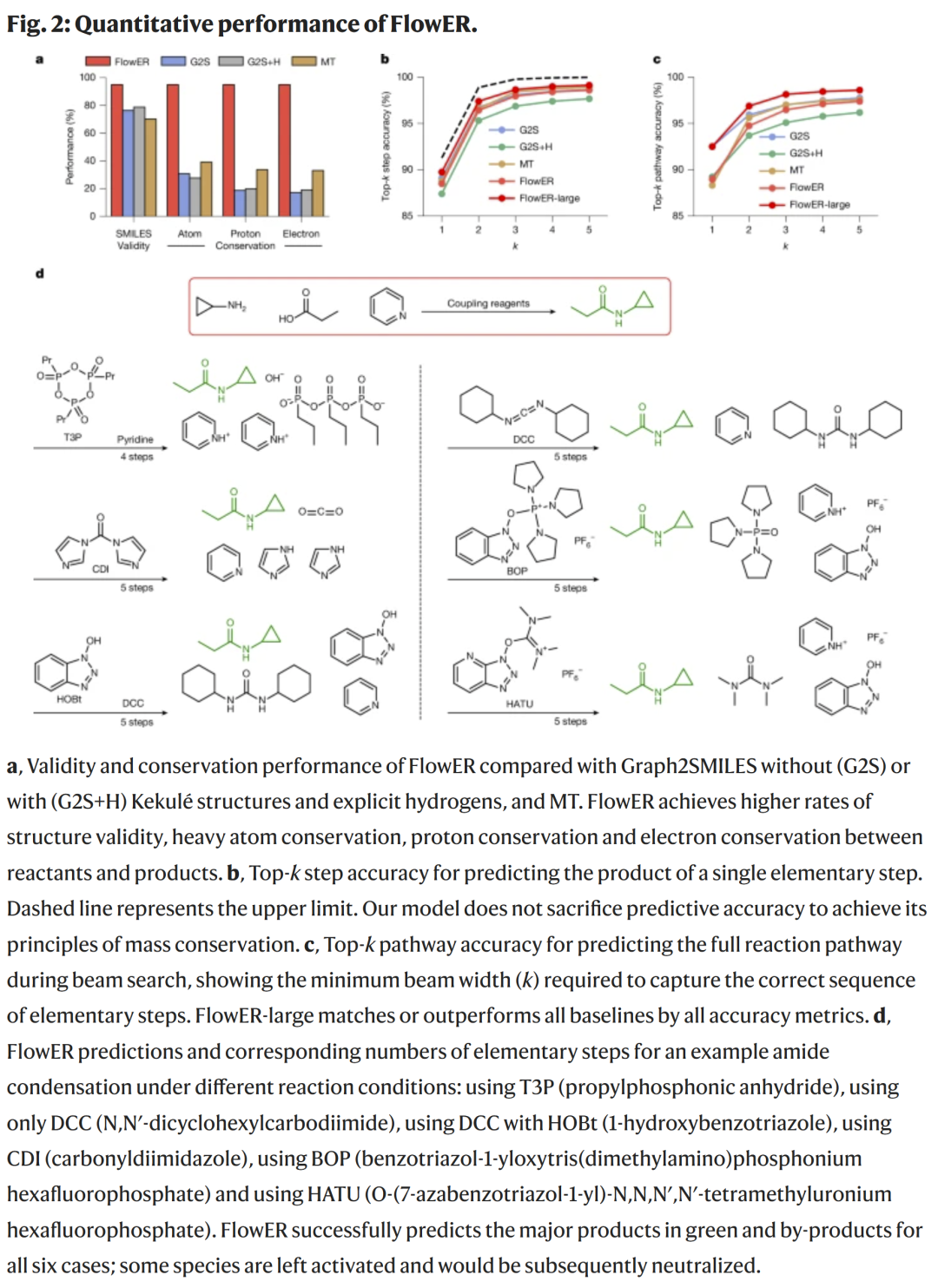 FlowER 能够区分不同条件下的反应路径。例如,在羧酸与胺缩合的案例中,它能给出不同试剂条件下的多步机理,并预测主要产物和副产物。这体现了模型对反应条件的适应性。