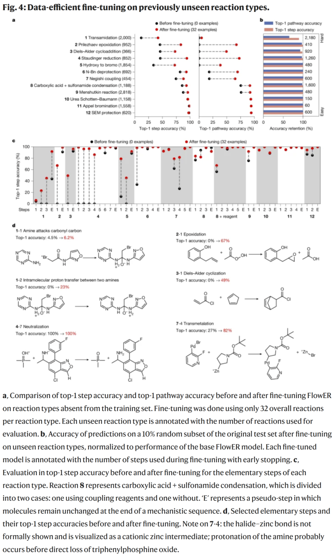 在 12 种训练集中未出现的反应类型上,FlowER 仅用 32 个新样本进行微调,就能在多数情况下达到 65% 以上的路径预测准确率,且不会遗忘原有知识。除了“酰胺交换”反应外,其余类型均显著提升。这凸显了模型在新化学领域的可扩展性与数据高效性。