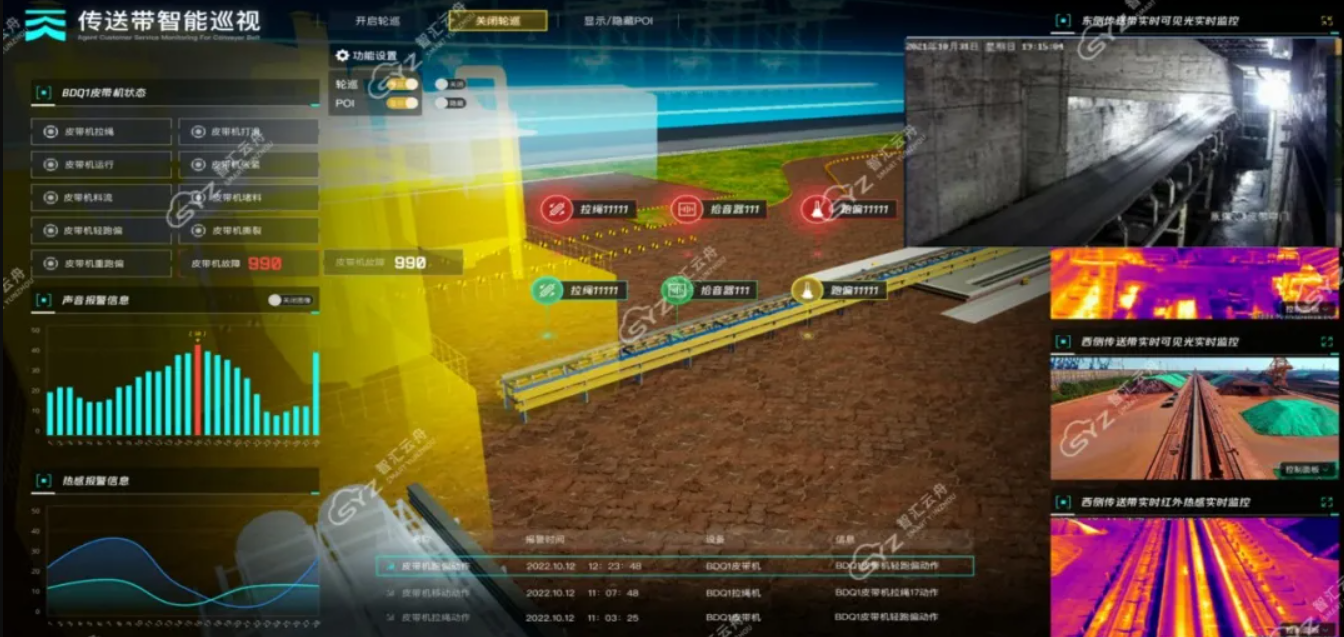 系统接入音频检测监测系统数据,通过声纹传感器不断监听托辊状态和皮带运行过程,并对异常情况进行及时报警。依托空间智能的精准定位技术,联动三维场景快速定位异常部位,点检员派遣机器狗前往处置。