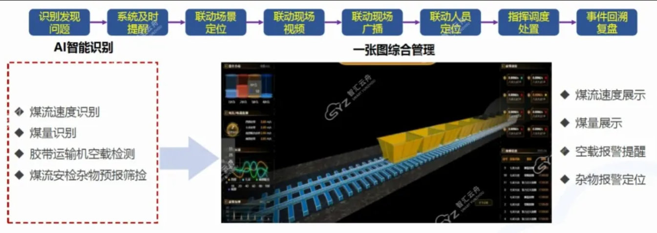 基于视频孪生引擎,融合空间智能的全空间感知技术,在煤矿三维场景中对整个主运环境进行实景三维构建,直观还原主运矿坑结构、设备分布等。利用 AI 识别算法,实现对主运过程中煤量、煤流速度、胶带运输机空载等进行自动识别,并基于三维场景,借助空间智能的全局协同能力,实现对主运生产态势的三维可视化联动管理。
