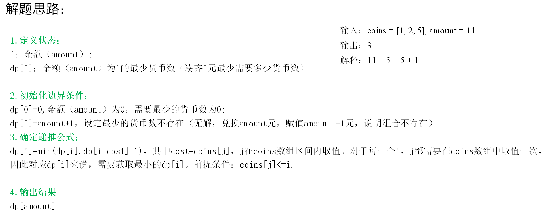 //1.定义状态. i:币值; dp[i]:币值为i的最少货币数; dp[i]表示凑齐i元最少需要多少货币数