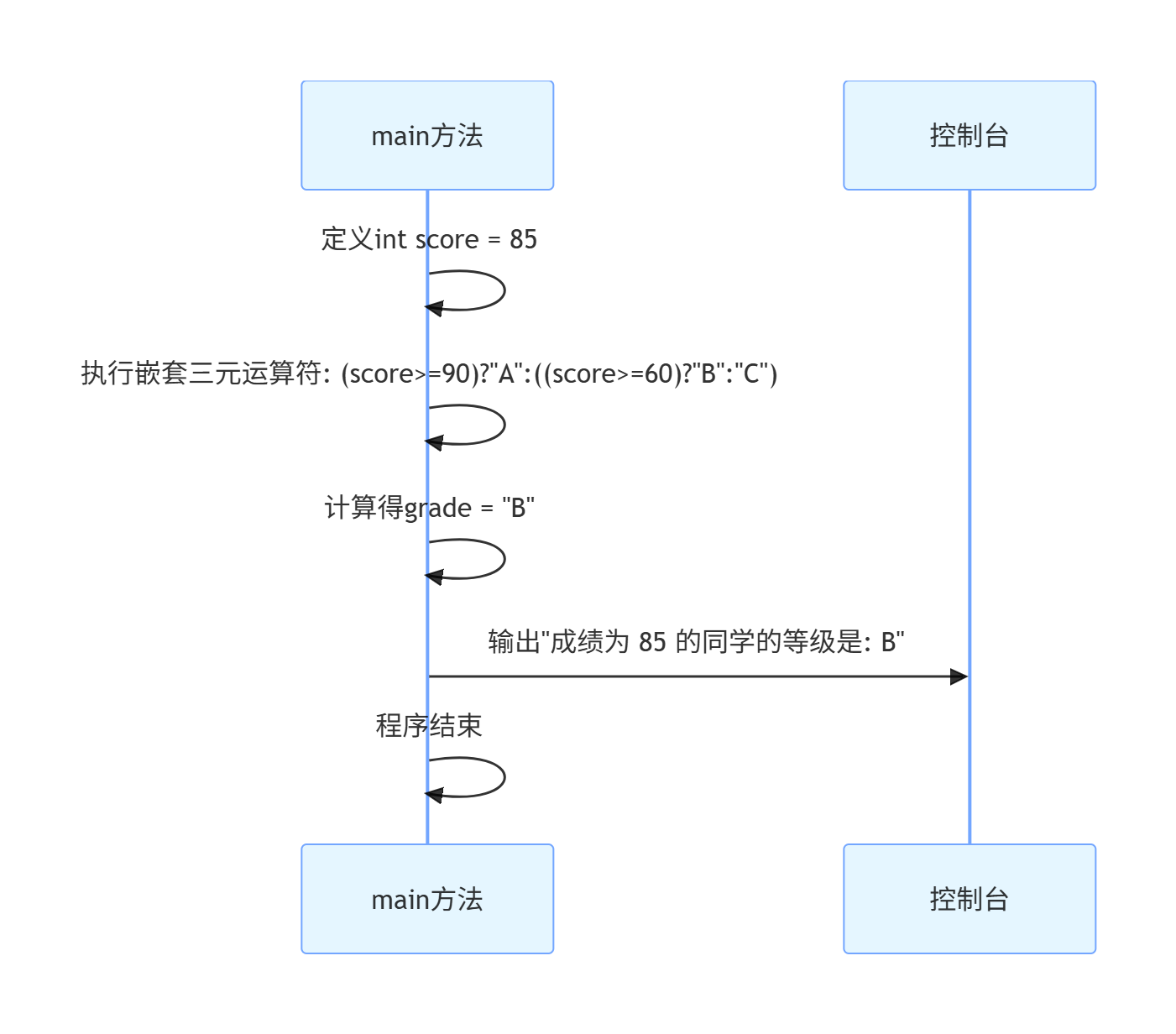 }score 来存储学生的成绩。? : 来进行多级条件判断: score >= 90,则 grade 被赋值为 'A'。score >= 60,则 grade 被赋值为 'B'。grade 被赋值为 'C'。System.out.println 方法输出学生的成绩和对应的等级。假设 score 的值为 85,则程序的输出将是: