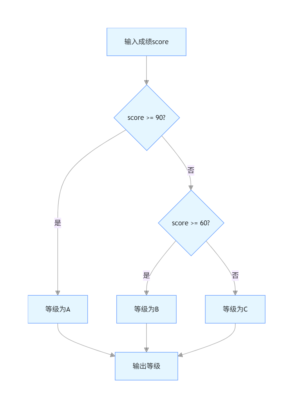 成绩为 85 的同学的等级是: B你可以修改 score 变量的值来测试其他成绩范围的情况,例如: