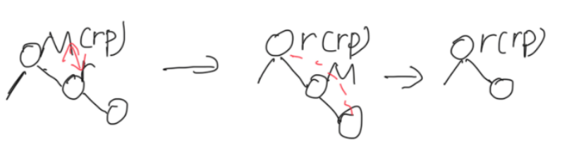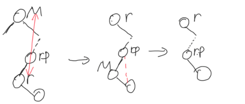 (2)反常情况:M的子节点只有右节点 此时M就是rp,r为rp右节点,和正常情况恰好相反 交换r和M的值,再删r节点连rp和r子节点