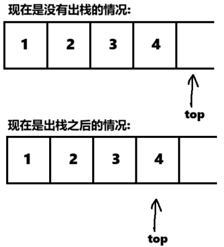 为什么我们只是将top向前一定了一位就完成了出栈的操作呢??这是因为,top我们定义它代表的是当前栈顶元素的下一个位置,当top向前移动一位,就说明现在的栈顶元素是3,而不是4了,这样在输出的时候就直接忽略掉4这个元素,在我们想要继续增加元素的时候,4也会被重新覆盖掉,所以这个方案巧妙就巧妙在只用移动top.下面是具体的代码: