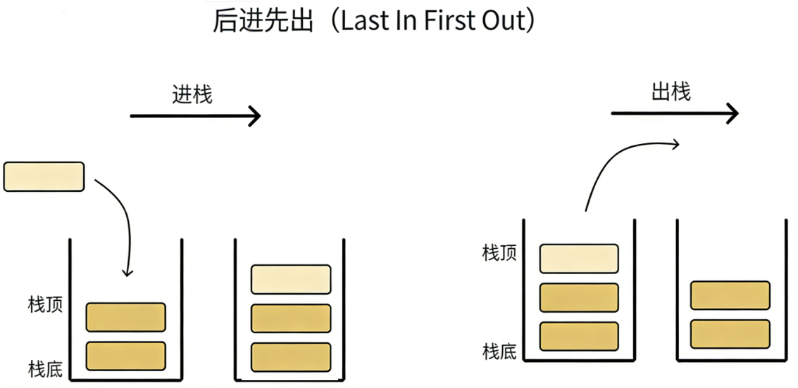 栈是一种特殊的线性表,它只允许在固定的一端进行插入和删除元素的操作。进行数据插入和删除的一端我们将其称之为栈顶,另一端不变的我们将其称之为栈底。站中的元素遵循后进先出LIFO(Last in fisrt out)的原则. 我们将栈的插入操作叫做进栈/压栈/入栈 将栈的删除操作叫做出栈,出数据也在栈顶