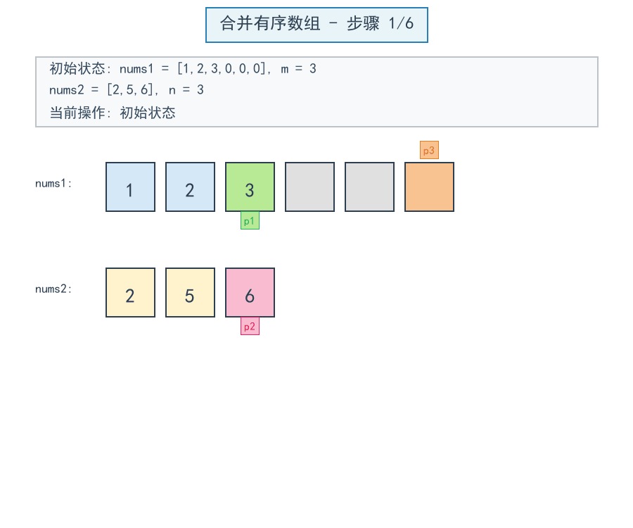 我们可以先将nums2放到nums1的末尾,再排序,这样确实可以达到目的,时间复杂度是O(n),但是这样就不能达到进阶的要求了,我们还能怎么做呢?小意思,我们可以从nums1最后的地方开始放进去,用三个指针,一个指向nums1非0元素的最后一个元素,一个指向nums1的末尾,一个指向nums2的末尾,如下面的的视频所示: