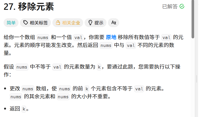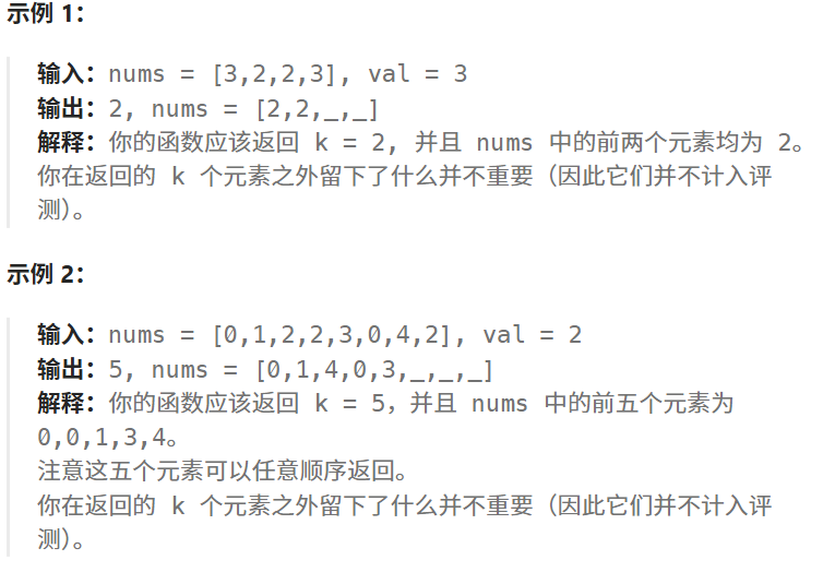 这是题目链接:27.移除元素,下面是具体的题目与示例: