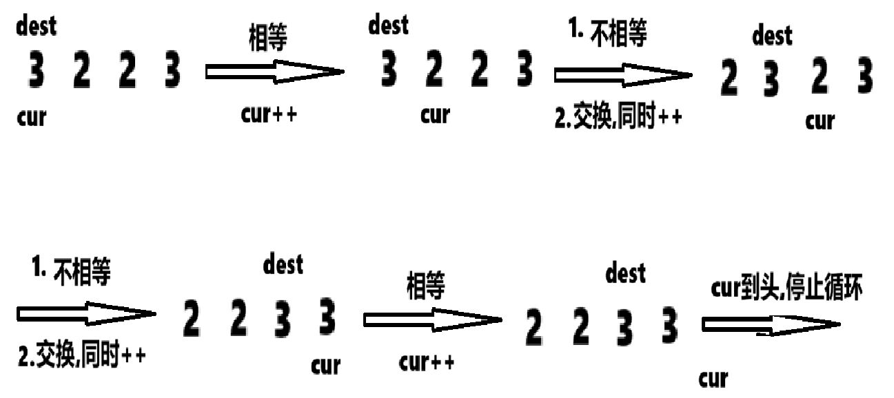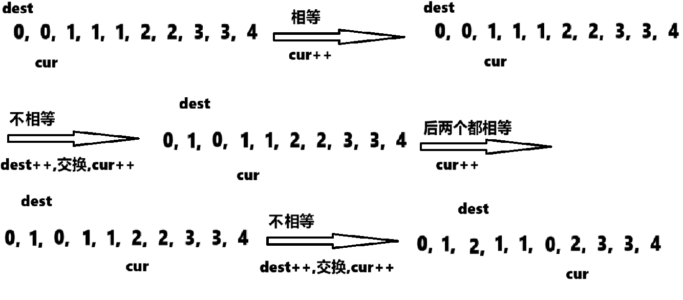 我们用两个指针,刚开始都同事之下那个num数组的第一个元素,随后将其中一个指针用于遍历数组,如果两个指针指向的内容不相同,那就将内容进行交换,两个指针同时向后移动一位;如果相同,那就只有遍历的指针移动,下面是示意图: