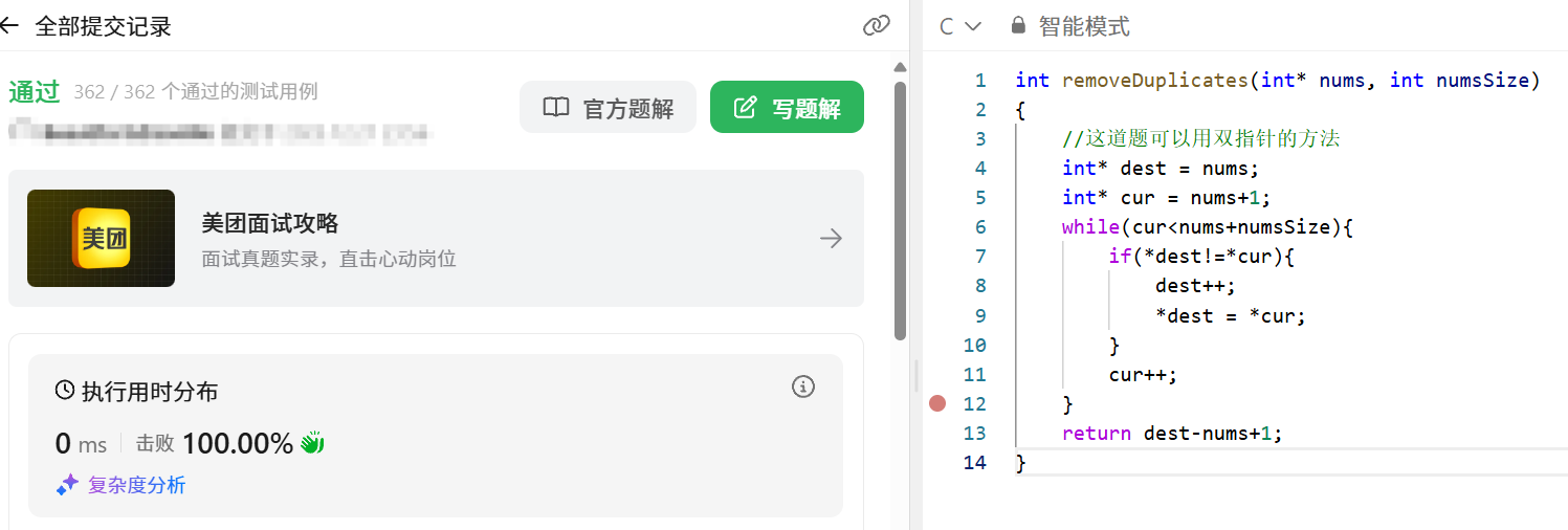 由题意知,这道题是想让我们将数组中重复的元素删除,同样的不能创建新的数组,那就继续使用双指针算法:用两个指针,dest与cur,如果*dest !=*cur,那就交换*dest与*cur的值,两者同时++即可,如果两者指向的元素相等,那就只有cur++,,dest保持不变