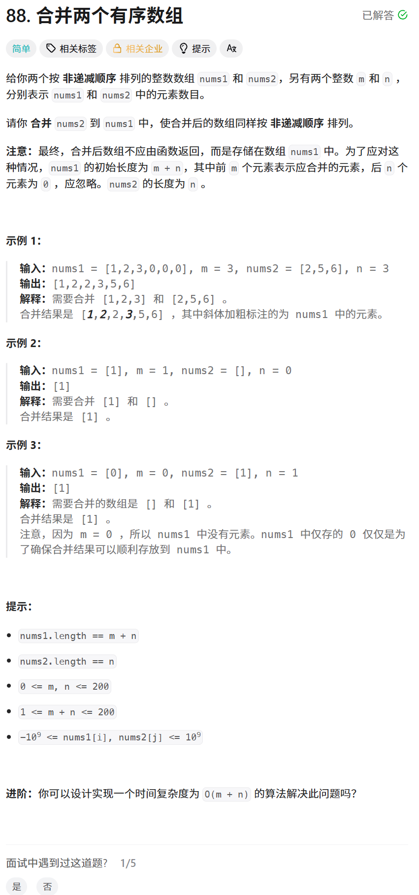 这是题目链接:88. 合并两个有序数组,下面是具体题目: