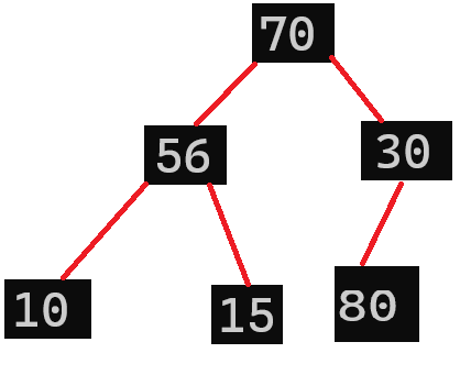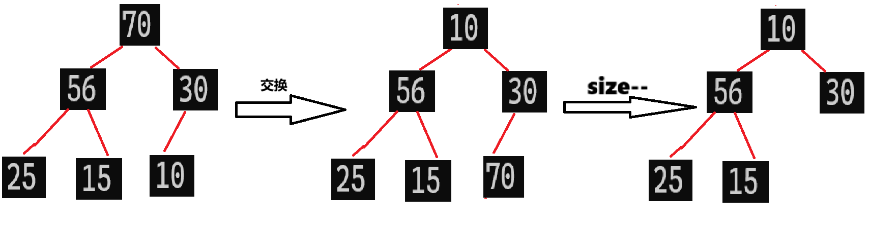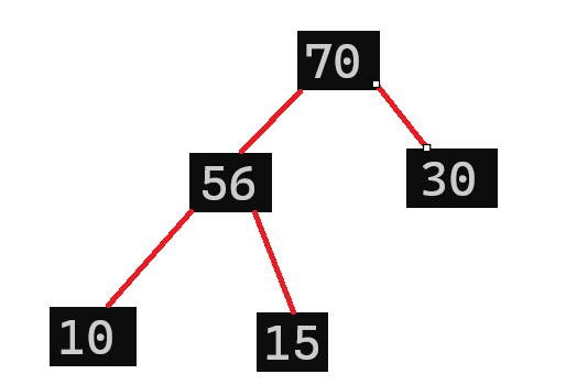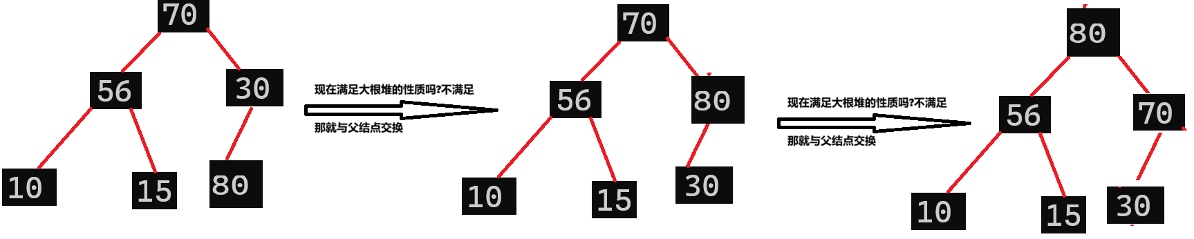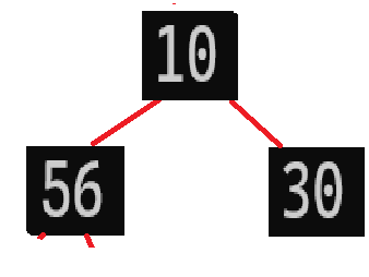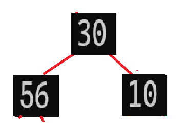 这时候30作为父节点还是比子节点56小,还是要与56交换一遍,所以我们为了效率的提升,直接一步到位:将父结点与其最大的子节点交换,也就是说,10直接和56交换: